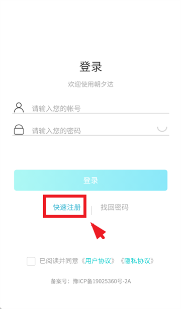 下载安装并打开朝夕达物流软件,进入登录界面后点击快速注册