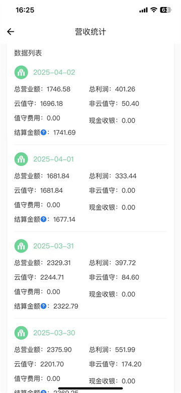 下拉查看“数据列表”,可查看“总营业额、总利润、云值守、非云值守、值守费用、现金收银、结算金额”等数据,店铺真实营收情况一目了然