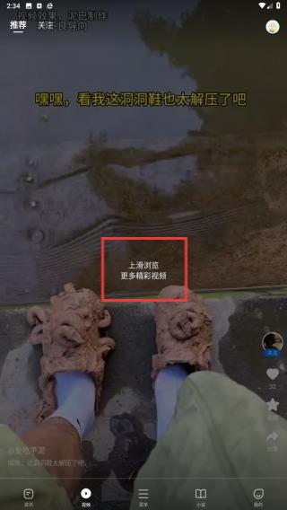 2、在视频的页面,会自动呈现出较热门的视频,根据文字提示:上滑浏览更多精彩视频进行操作。