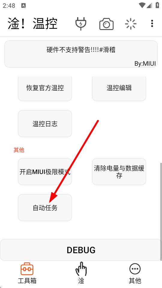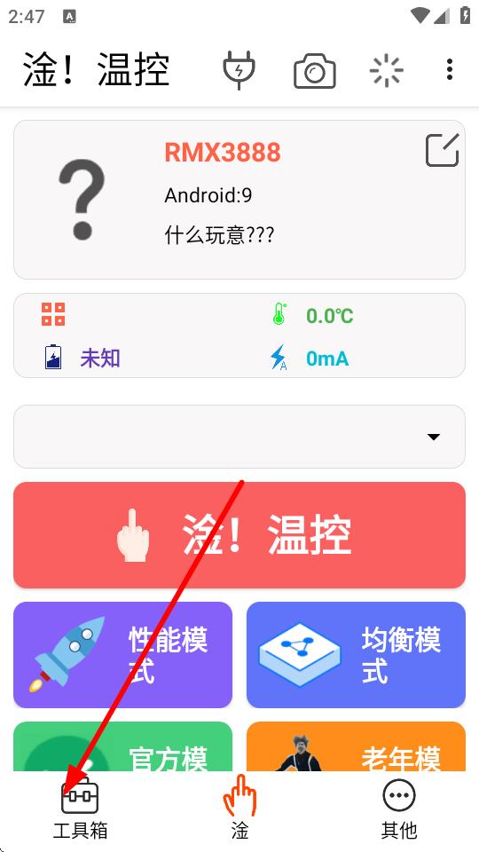 1、打开淦!温控应用程序,点击界面下方的工具箱按钮进入工具箱界面。