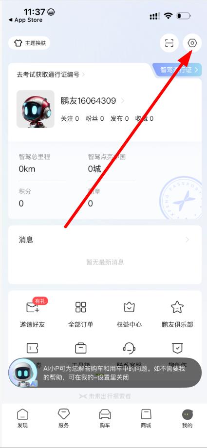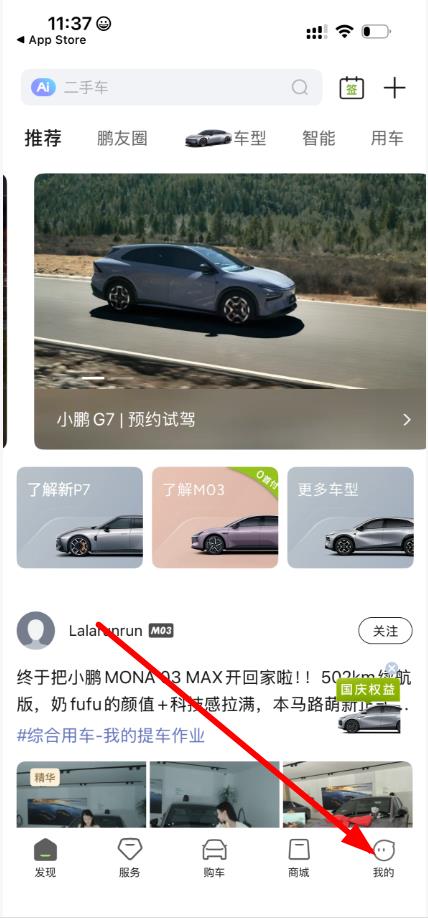 1、打开小鹏汽车APP,点击底部导航栏中的我的选项,进入个人中心页面。