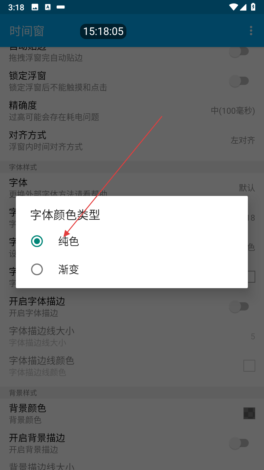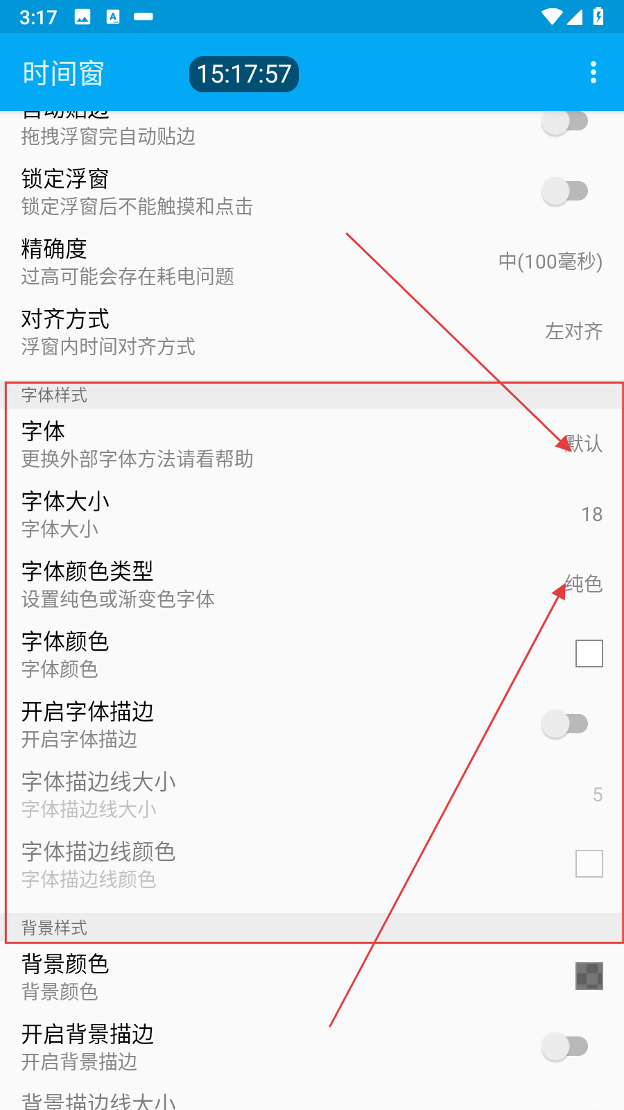 1、打开时间窗应用进入设置界面,在设置选项中找到字体样式相关设置区域,这里包含字体、字体大小、字体颜色类型等多个设置项。