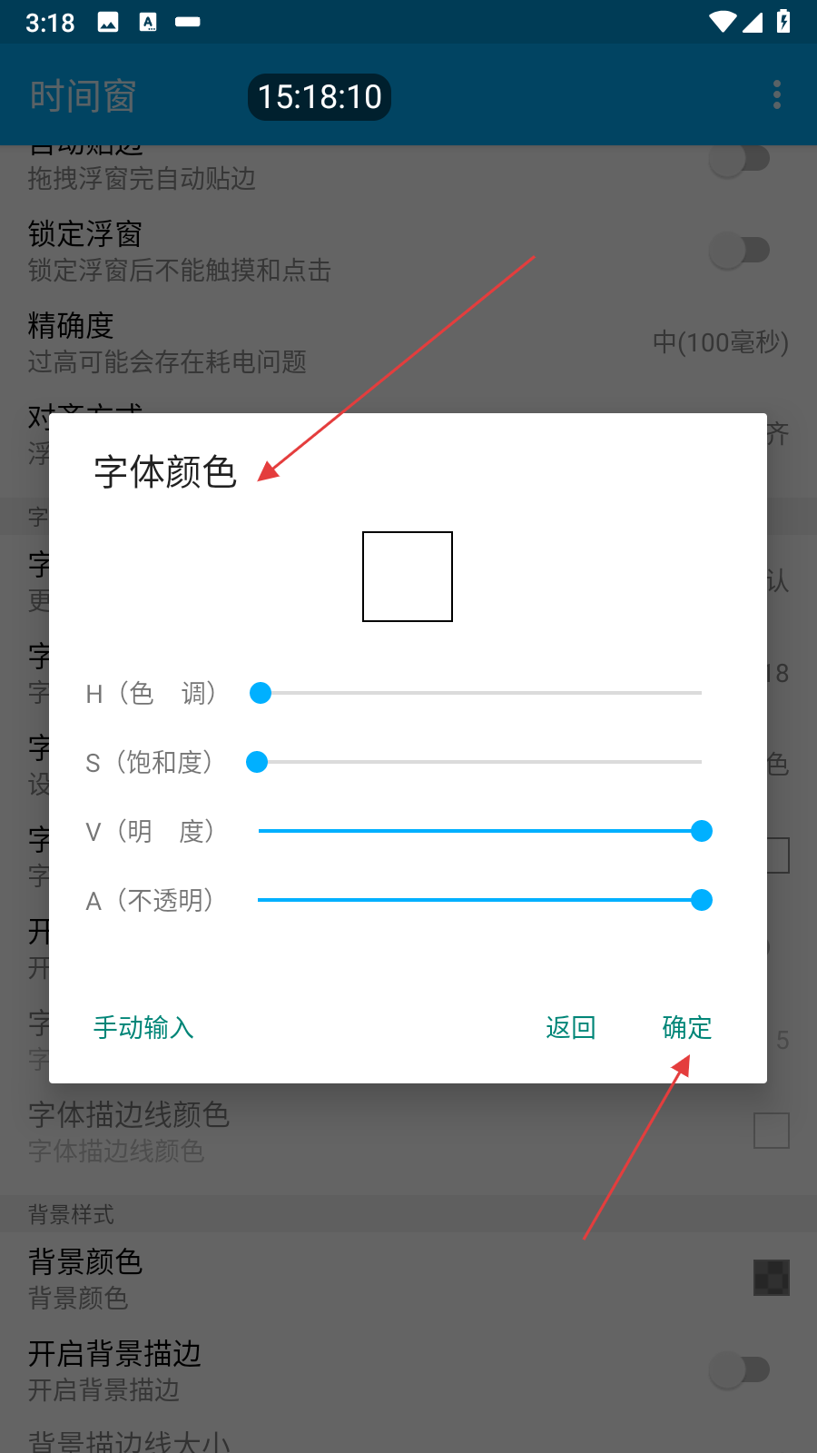 3、在弹出的颜色设置框中,通过调整H、S、V、A滑块,或手动输入颜色值来选择颜色,选好后点击确定。