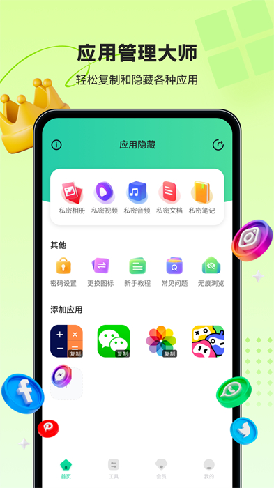 ①、隐藏软件图标,自由选择需要隐藏的应用,并设置特定的隐藏方式,让隐私更安全可靠;