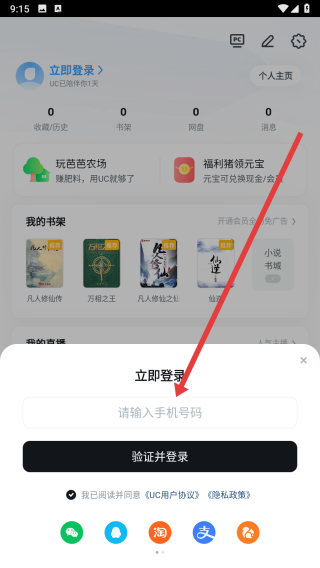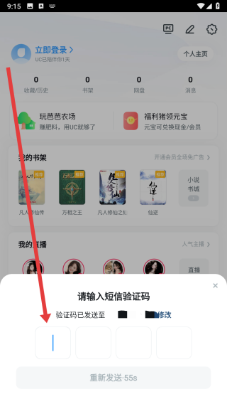 3、在立即登录弹窗出现后,点击输入框填写手机号码以获取验证码。