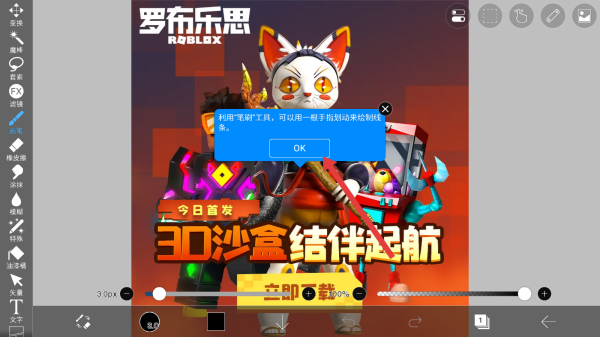 1、导入罗布乐思宣传图后,界面弹出气刷工具使用提示弹窗,点击OK确认,即可开始借助该工具在图片上进行绘画创作。