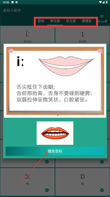 1、进入音标小助手,选【音标】【单元音】等分类,点【播放音标】听发音、看口型。