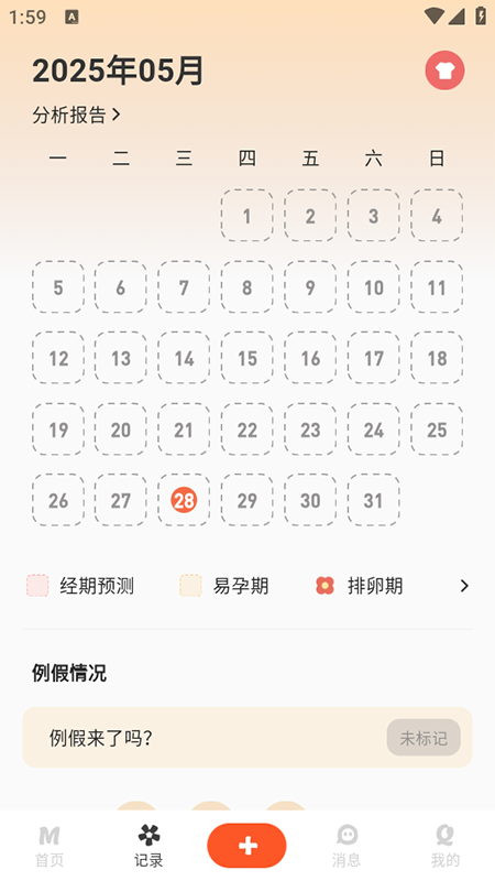 2、进入App主界面,点击“记录”选项。在经期记录页面,输入本次月经开始日期和结束日期,选择血量等例假情况。点击“保存”按钮,完成经期信息记录。