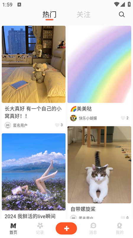 3、点击首页,可以浏览推荐的主题文章和用户帖子。点击感兴趣的帖子,查看详细内容,可对帖子进行评论、点赞。也能发布匿名帖子