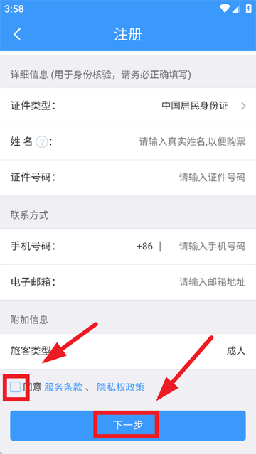 5.信息填写完成后,点击同意服务条款,隐私权政策,最后点击下一步即可注册。如图所示