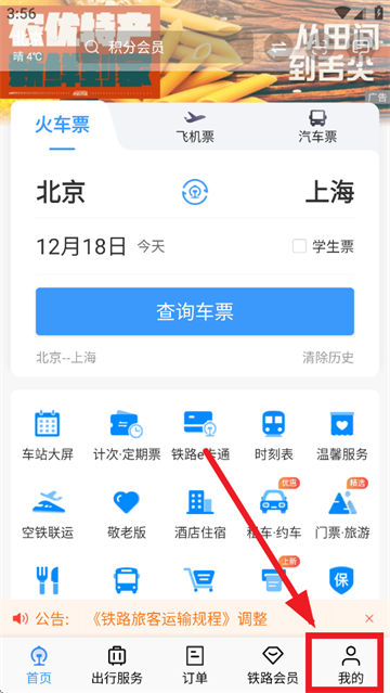1.下载安装并打开铁路12306软件,在打开的首页界面,点击底部右边的我的。如图所示