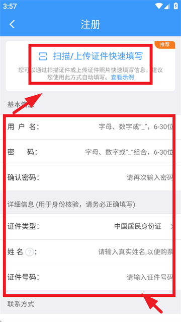 4.打开注册界面后,可以通过扫描/上传证件快速填写,也可以按照要求逐步填写信息。