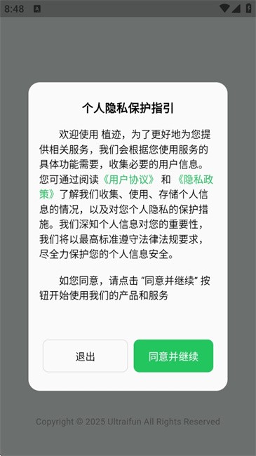 1、在本站下载安装植迹app后,阅读用户隐私协议之后点击“同意并继续”就可以使用了;
