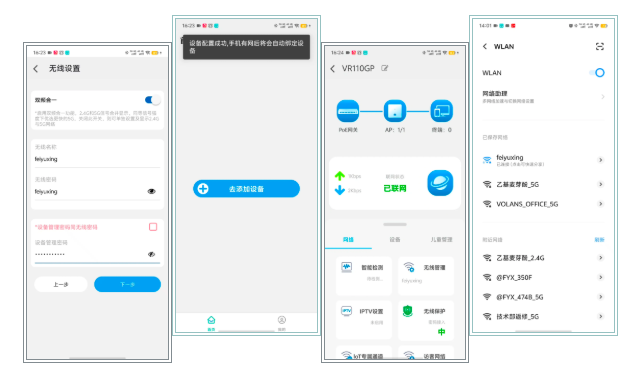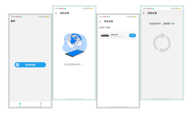 打开飞鱼星智家APP,点击“去添加设备”,APP将自动发现组网设备,并点击“添加”,随后会自动完成上网配置。