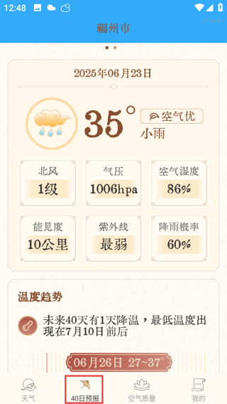 2、进入天气详情页,点击底部【40日预报】,查看未来40天的温度变化趋势。