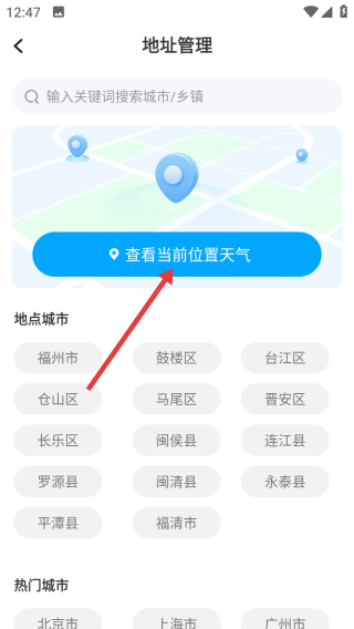 1、在地址管理页点击【查看当前位置天气】按钮,获取所在位置的天气信息。