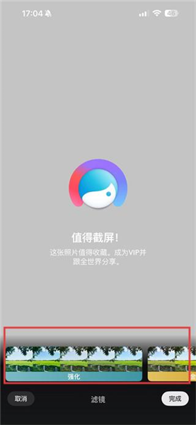 4、在滤镜效果选择界面,选择喜欢的滤镜效果,如强化滤镜,应用后点击完成按钮,保存修图后的照片。