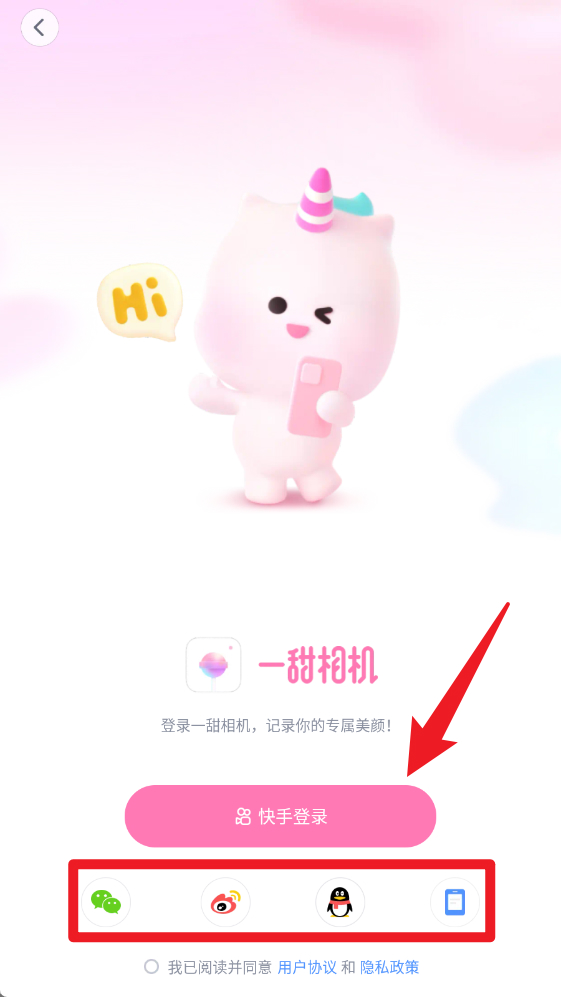 1、首次使用需要登录账号,可通过微信、微博、QQ或手机号快捷登录,登录后可同步保存拍摄和编辑记录。