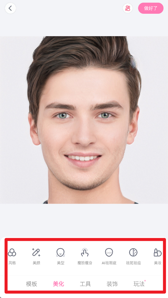 4、在修图页面中,用户可自由调整美颜、美型、瘦脸瘦身、AI祛痘祛斑等多种细节,轻松实现自然又完美的自拍效果。