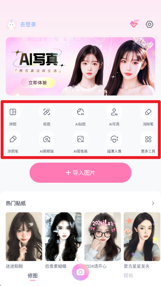 2、进入首页后,可以选择拼图、抠图、AI贴图、AI写真等多种工具,满足从日常修图到创意玩法的不同需求。