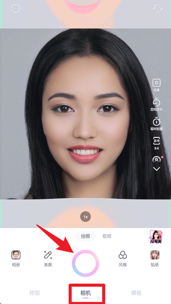 3、切换到“相机”模式后,点击拍照按钮即可实时拍摄,支持美颜、风格滤镜以及贴纸叠加,打造专属个性照片。