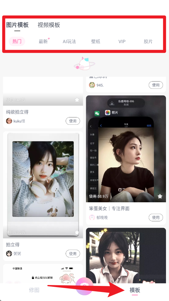 5、点击下方的“模板”功能,可以浏览热门、最新、AI玩法等不同类型的图片模板,选择喜欢的风格即可应用。