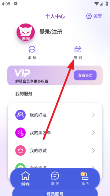 1、打开喵瞄社交APP,即可选择登录方式登录,即可在线查找好友聊天;