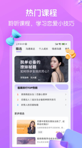 4.恋爱情话:不同场景见面聊天话术拈手即来,各种恋爱技巧、 liao妹话术,恋爱话术,恋爱脱单、分手挽回、婚姻家庭、聊天 技巧、情感修复,教你如何谈恋爱,提高情商,为你的恋爱情感 保驾护航;更有相亲攻略和表白指南等你来看!