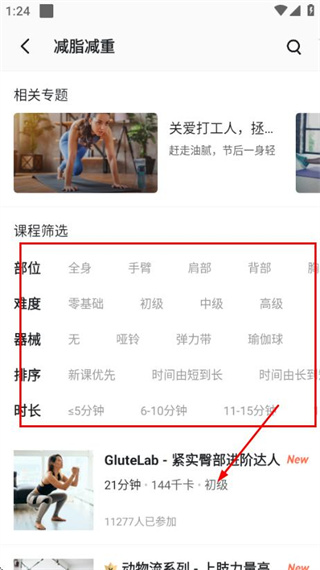2、在减脂减重页面,点击目标课程,进入该课程的详情页面。