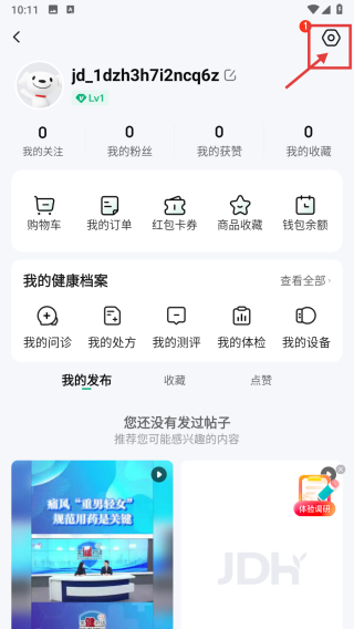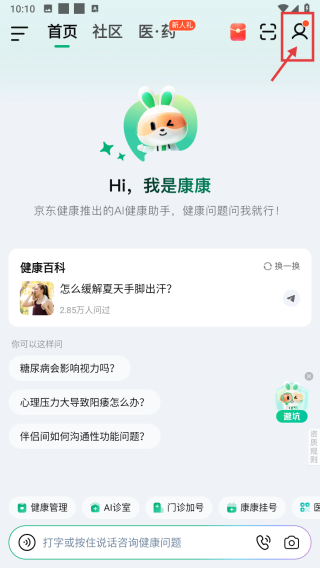 1、打开健康服务类APP,点击右上角个人中心图标,进入个人页面。