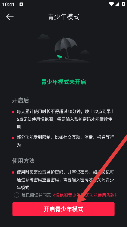 4、在青少年模式页面点击开启青少年模式,按照提示开启模式。
