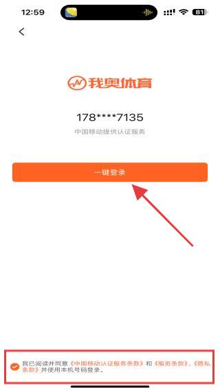 3、勾选页面下方我已阅读并同意中国移动认证服务条款和服务条款、隐私政策并点击一键登录的功能按钮。