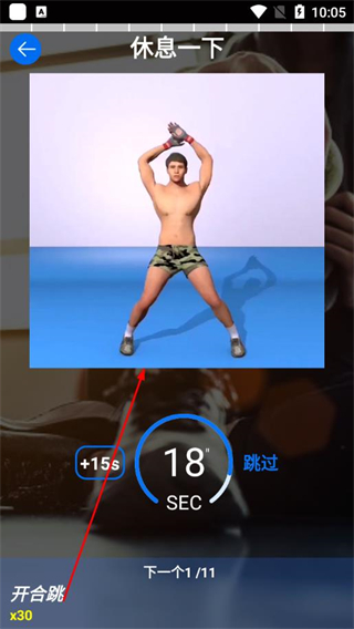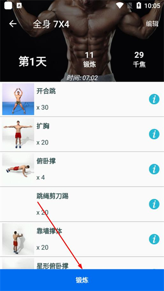 3、在训练列表页面确认动作内容后,再次点击底部锻炼,进入训练流程。