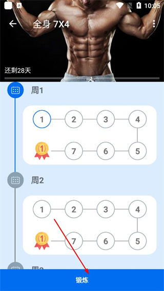 2、在计划详情页选择对应周次的训练日,点击底部锻炼进入当日训练列表。