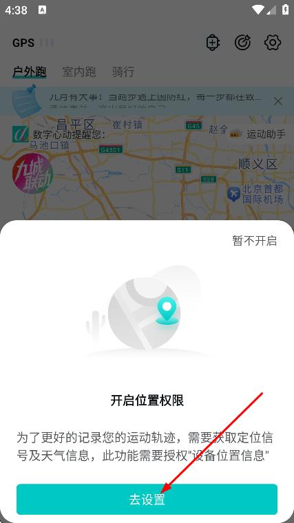 2、若弹出开启位置权限弹窗,点击去设置,设置位置权限。