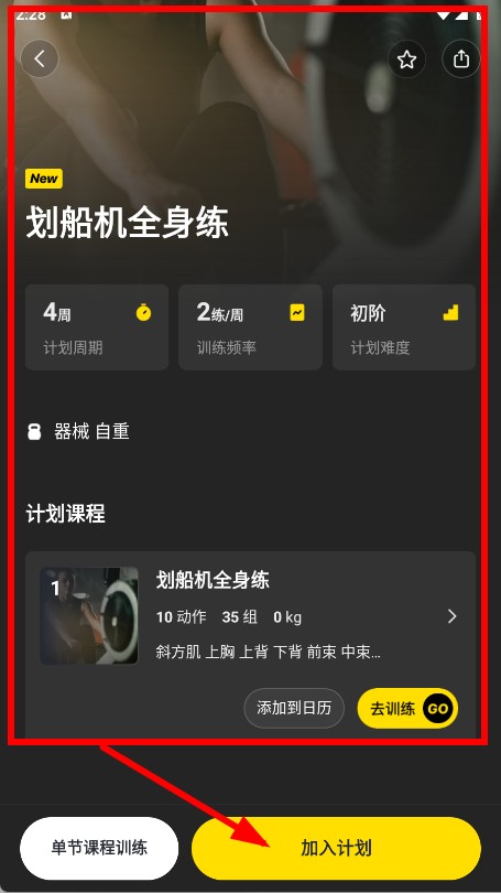 4、进入详情页面后,点击底部加入计划按钮,将该训练加入计划。
