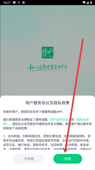 1、打开瘦吧app后,可以点击同意按钮后,开始进入使用。