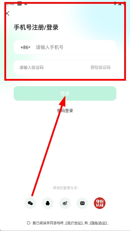 4、输入手机号,获取并填写验证码,勾选后,点击登录,完成注册。