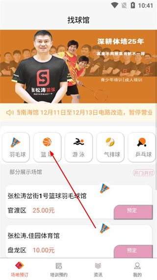 1、打开找球馆app的场地预订页面,点击篮球分类,筛选出篮球相关场馆列表。