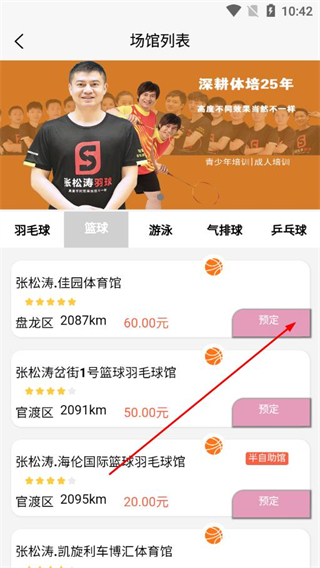 2、在篮球场馆列表中,选择目标场馆,点击其右侧的预定,进入场馆详情页。