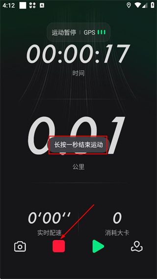 4、暂停运动后,长按红色结束键并保持一秒可结束运动。