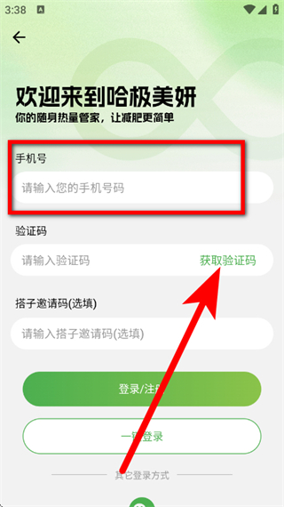 3、在登录注册页面,输入手机号码,点击获取验证码。