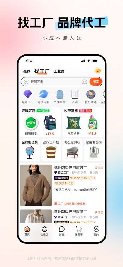 生意经等批发采购场景。覆盖全行业:电子元器件,工艺礼品,宠物园艺,家装建材,机械,食品饮料,餐饮生鲜,橡塑制品,家纺家饰,内衣,童装,安防,电工电气,
