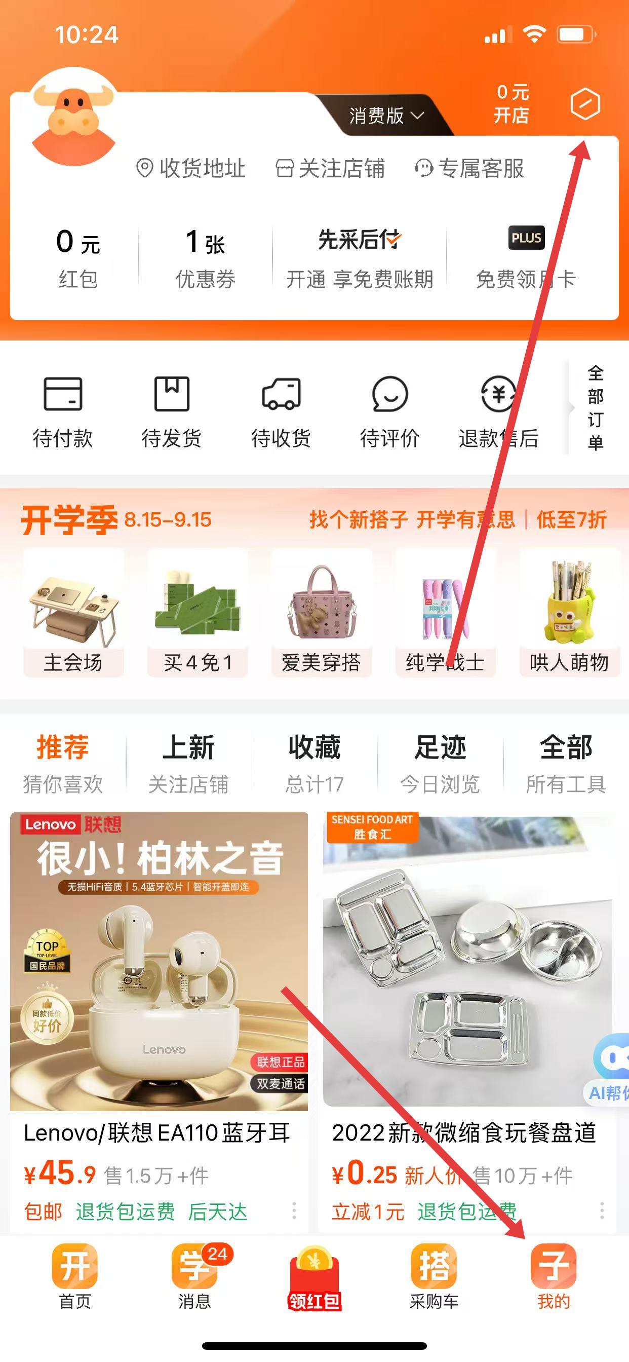 1、打开1688 APP,点击右下角我的,再点击右上角的设置图标,进入设置页面。