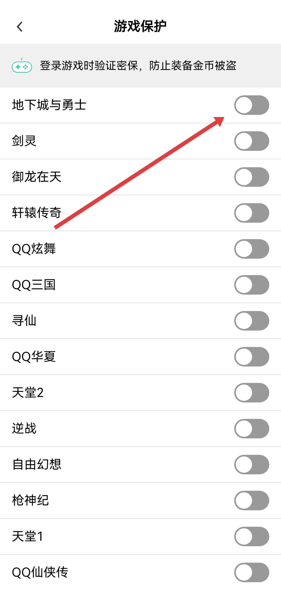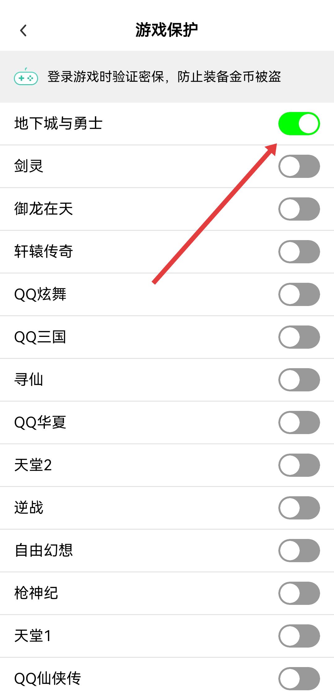 2、在游戏保护页面中,找到需要保护的游戏如地下城与勇士,定位其右侧的开关按钮。