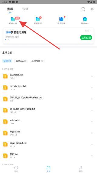 2、在文件推荐的页面内,找到并点击扫描文件的操作提示。