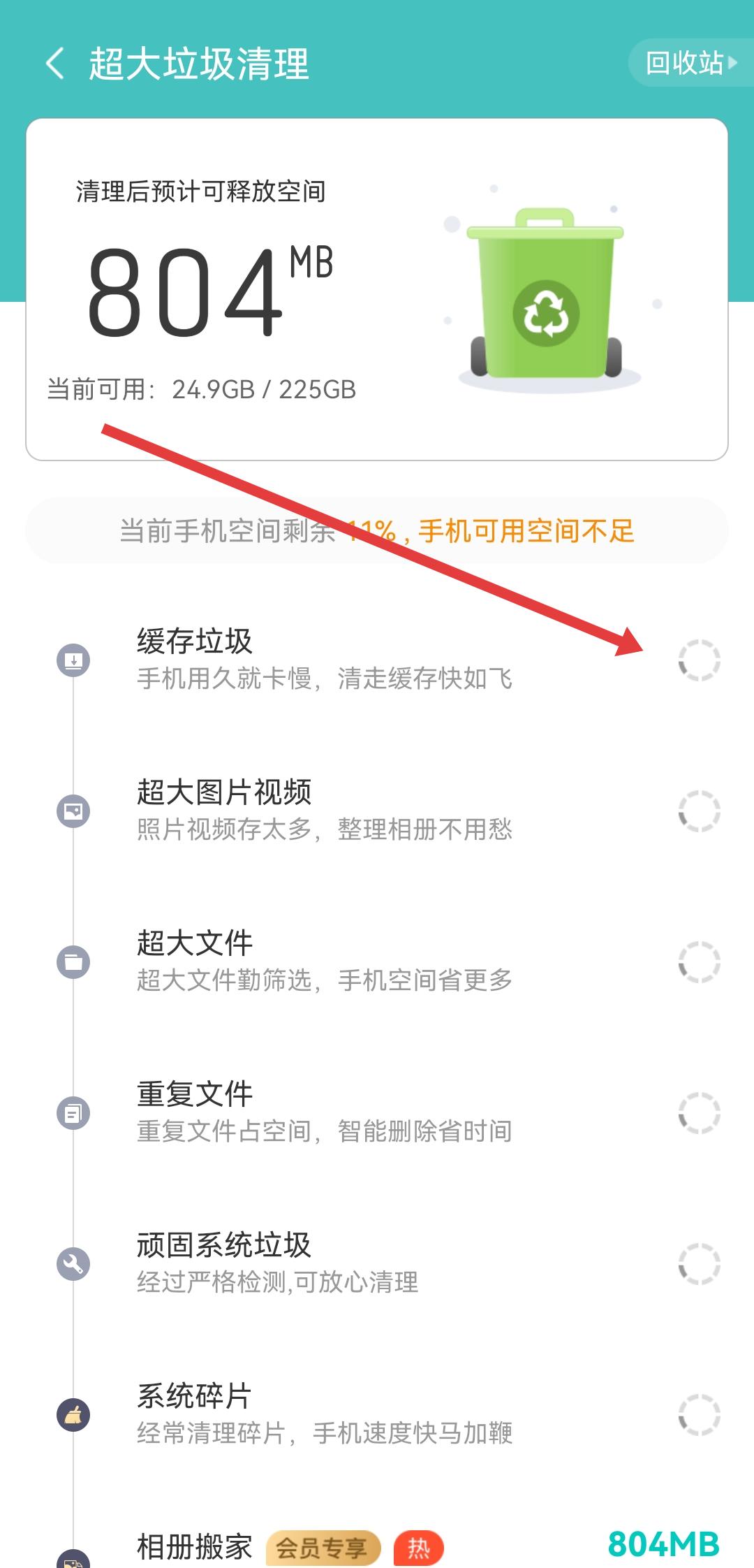 2、等待系统自动扫描手机中的缓存垃圾、超大图片视频、超大文件等内容,界面显示清理后预计可释放空间。