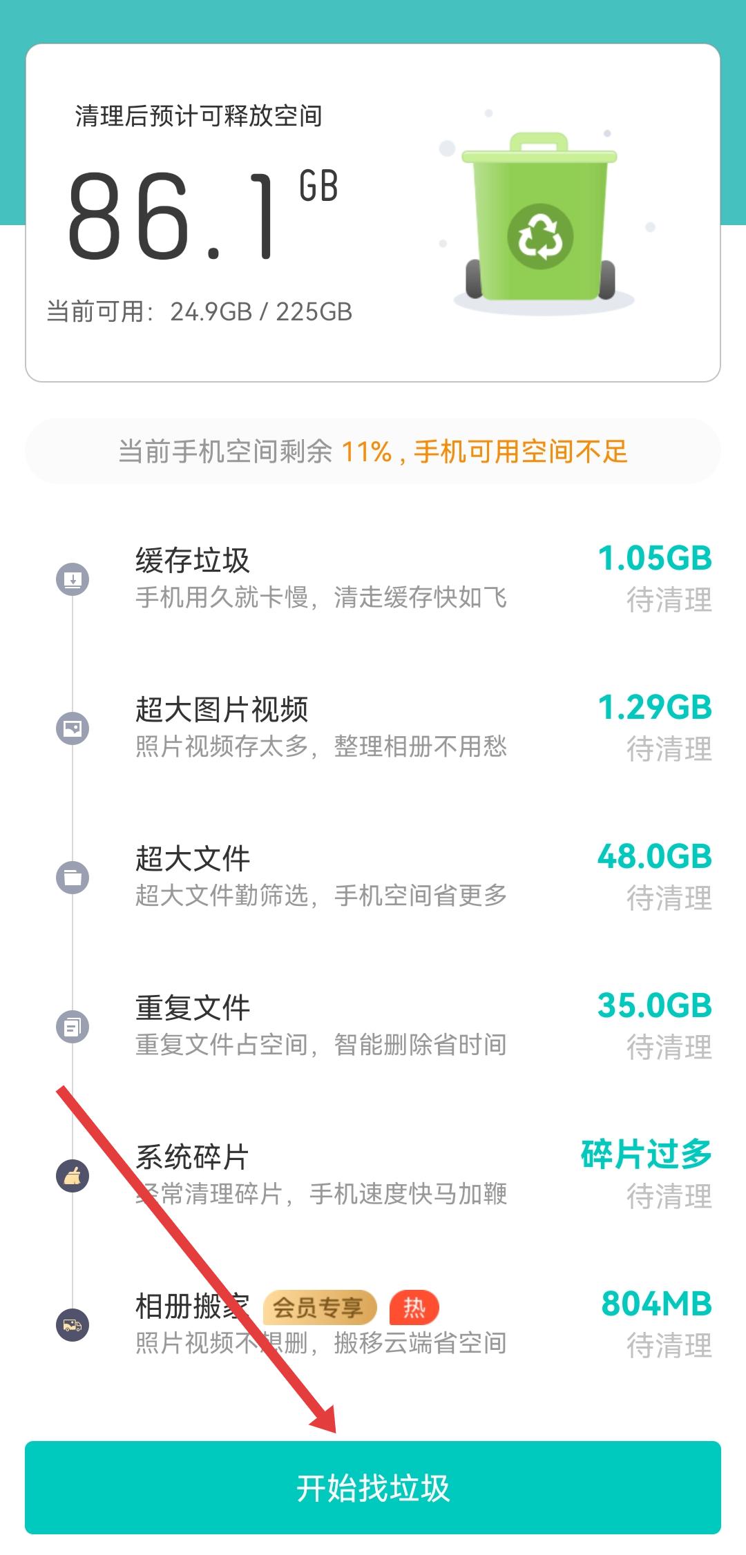 3、扫描完成后,点击底部开始找垃圾或对应清理按钮,按照提示完成垃圾清理操作。