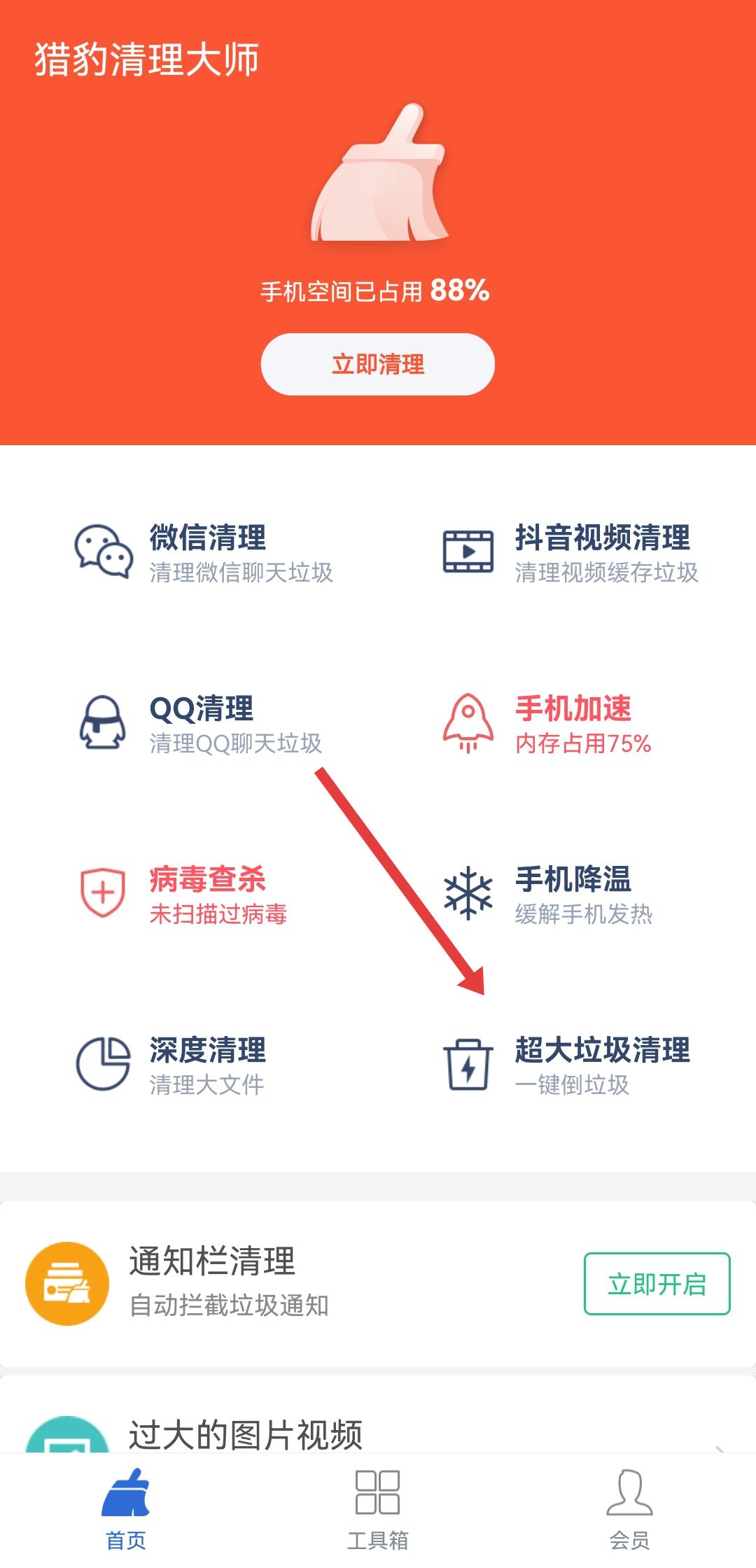 1、打开猎豹清理大师APP,在首页功能区点击超大垃圾清理选项,进入垃圾扫描的界面。