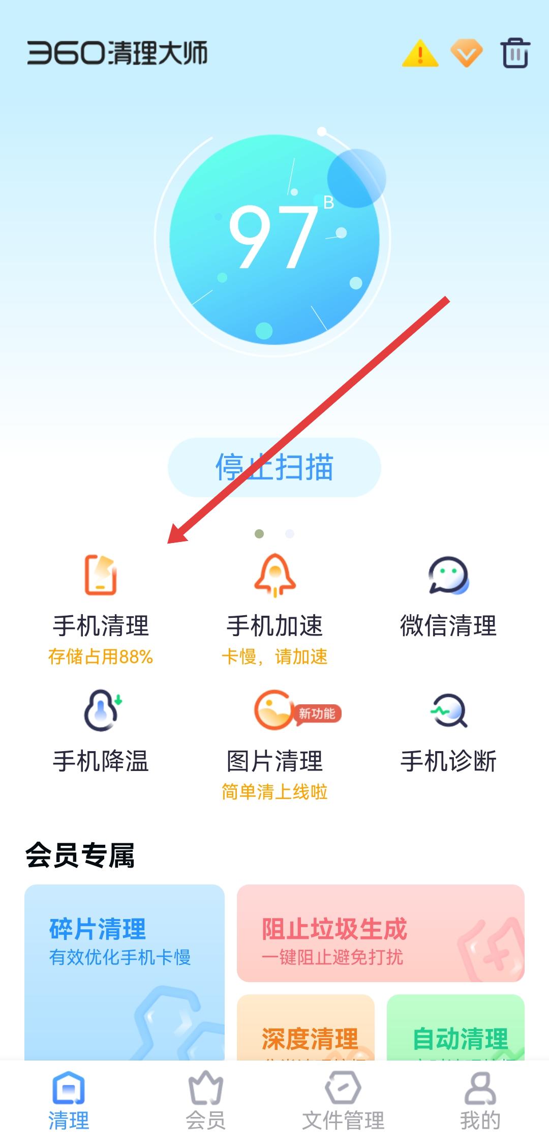 1、打开360清理大师APP,需要在首页点击手机清理的选项,进入手机垃圾扫描的界面。